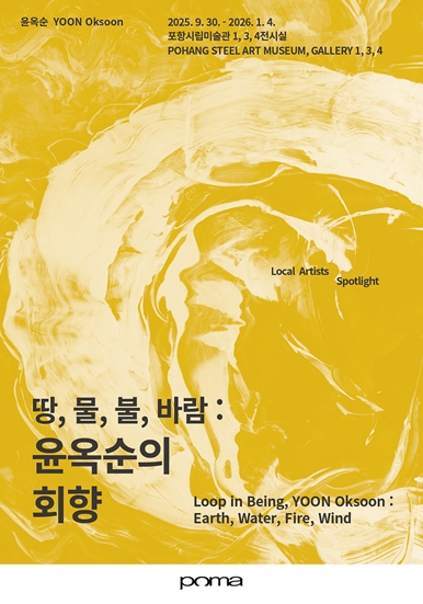 포항시립미술관은 지역 미술의 흐름과 미술사적 가치를 연구하는 지역작가조망전으로 《땅, 물, 불, 바람 : 윤옥순의 회향》을 마련하였다. 이번 전시는 경북 포항 출신의 작가 윤옥순이 걸어온 50여 년의 예술 여정을 고향 포항에서 조망하는 전시로, 그의 첫 회고전이다.