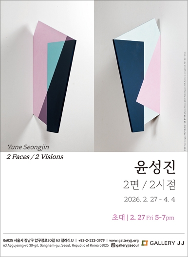 오늘날 조각은 소재나 표현 기법에 있어서 회화, 설치미술, 퍼포먼스, 영상 등과 혼성적 양식으로 나타나고 이러한 타 장르와의 결합을 통해 공간과 개념을 확장하고 있다. 갤러리JJ는 조각가 윤성진의 개인전 <윤성진: 2면 2시점>을 마련하였다. 윤성진은 회화와 조각을 넘어선 공간을 모색하고 동시대 조각의 새로운 경험을 탐색한다. 작가는 전통 조각의 물성과 양감을 최소화하여 회화적 평면을 지향하는 역설적인 접근방식으로, 회화적 평면의 양면을 가지는 추상적 오브제인 ‘2면 조각 (2-face sculpture)’을 제시한다. 그것은 조각 구조에 회화적 경험을 결합하는 것으로 나타난다. 이번 전시는 작가가 파리에서의 오랜 생활을 마치고 서울로 돌아온 이후 지난 4년간의 작업들을 모아 최초로 선보이는 자리로, <접힌 사각형> 등 신작을 비롯하여 그의 작업의 대표적인 ‘2면 조각’들을 소개한다. 전시는 20여점의 공간에 세우는 스탠딩 작업과 벽면을 이용하는 벽 작업으로 구성된다. 이번 전시는 그 동안 그가 사유하고 구축해온 특유의 조형 방식과 관람객의 시지각적 경험을 기반으로 하는 작품세계의 독자성을 조명한다.