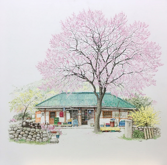홍매화 가게, with a pen, use the acrylic ink on paper, 122 x 162 cm, 2018