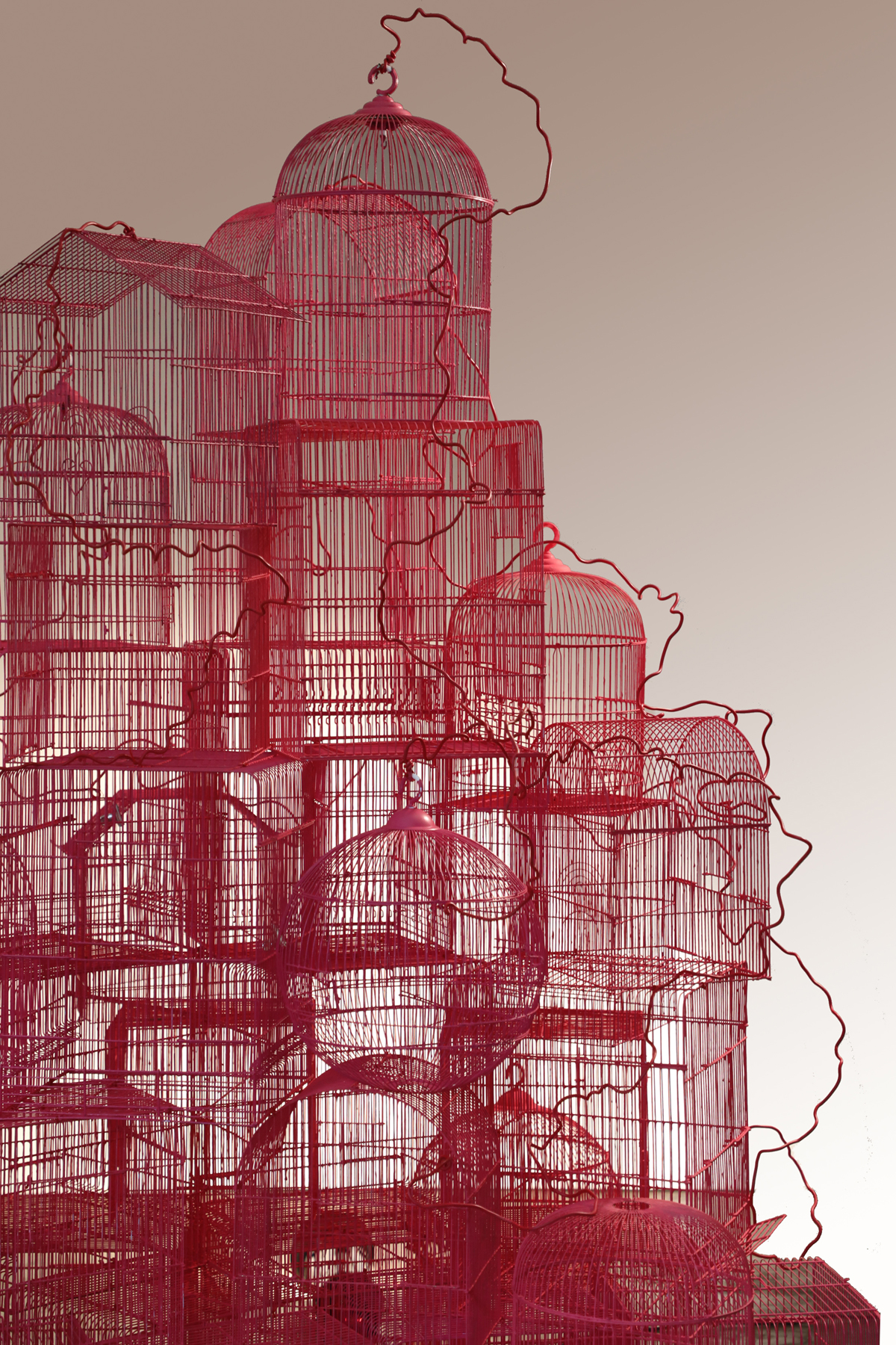 행복의 성_ 2017, 알루미늄 철재 새장, 태양열 외등, 야광페인트, 160x360x650cm