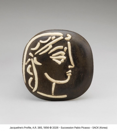 자클린의 옆모습, A.R. 385, 1956, 백토, 흑색 파티나 장식, 부분 유약 시유, 19×19×2.5cm(자료제공: 국립현대미술관)