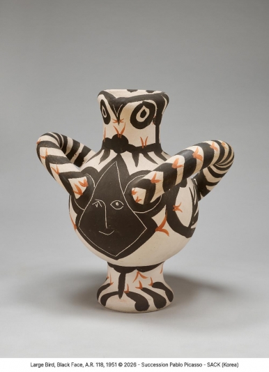 <큰 새와 검은 얼굴>, A.R.118, 1951, 백토, 화장토 장식, 나이트 각인, 50x47x38cm ⓒ 2023 - Succession Pablo Picasso - SACK (Korea)