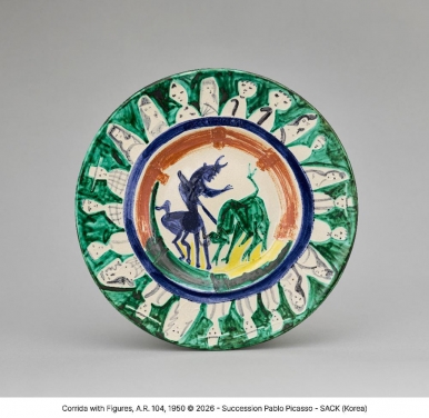 투우와 사람들, A.R. 104, 1950, 백토, 화장토 장식, 유약 시유, 38.5×38.5×5cm(자료제공: 국립현대미술관) ​