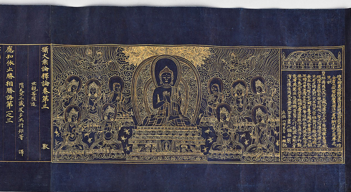 감지금니 섭대승론석론 권제3(紺紙金泥 攝大乘論釋論 券第三), 서울시 유형문화재 충숙왕 6년 1319 감지금니, 권축본 30.7x900cm, 12x354in. 변상도: 38×20cm, 14.9×7.8in. 위패: 10.5×20cm, 4.1×7.8in.