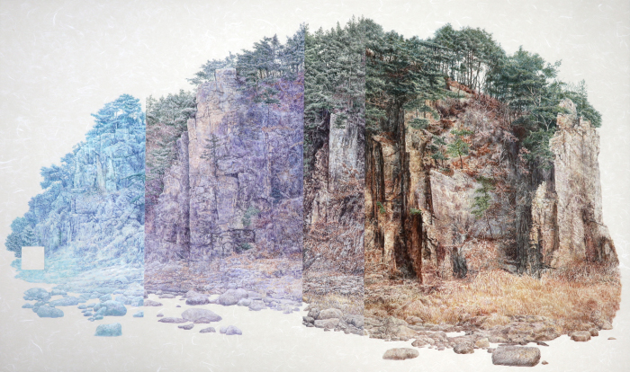 대강면2_ 천 한지(한지+천)에 먹, 아크릴릭, 호분_97x162.2cm_2025