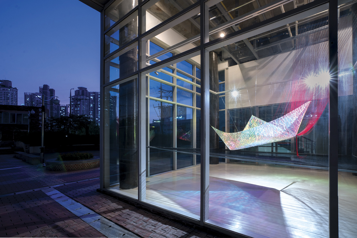 無와 有의 경계에서, 가변설치, Plastic tape, sewing, 오로라지, 2025