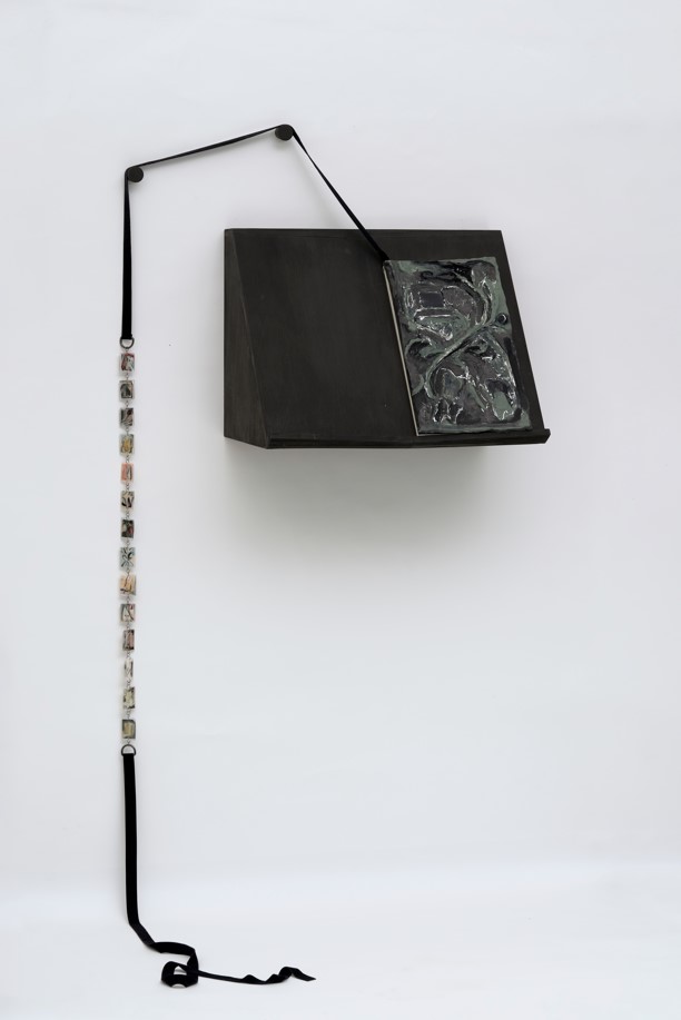 긴 꼬리 책, 2023-2025, 종이에 유채, 벨벳 리본, 투명 레진, 실크천, 아크릴, 고리, 45x25x3cm