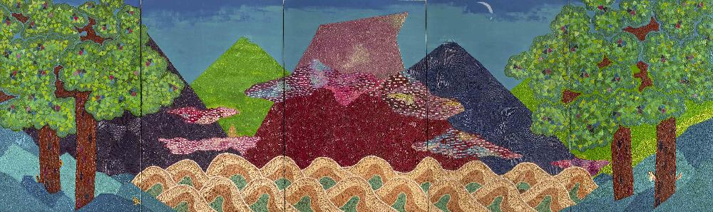 영축선알월오봉도, 2019, 목판에 자개, 난각, 옻칠, 150×500cm