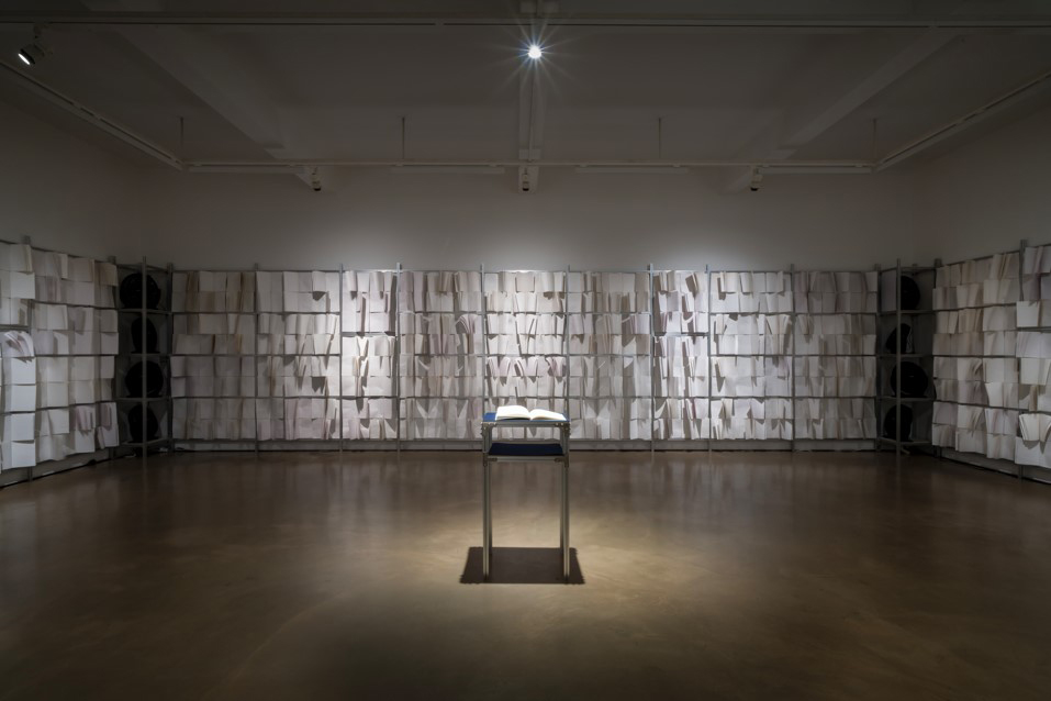 찰나 2001-1, 2026, 점자교과서 1,000권, 알루미늄 프로파일, 선풍기, 250x1000x890x800cm, 가변설치