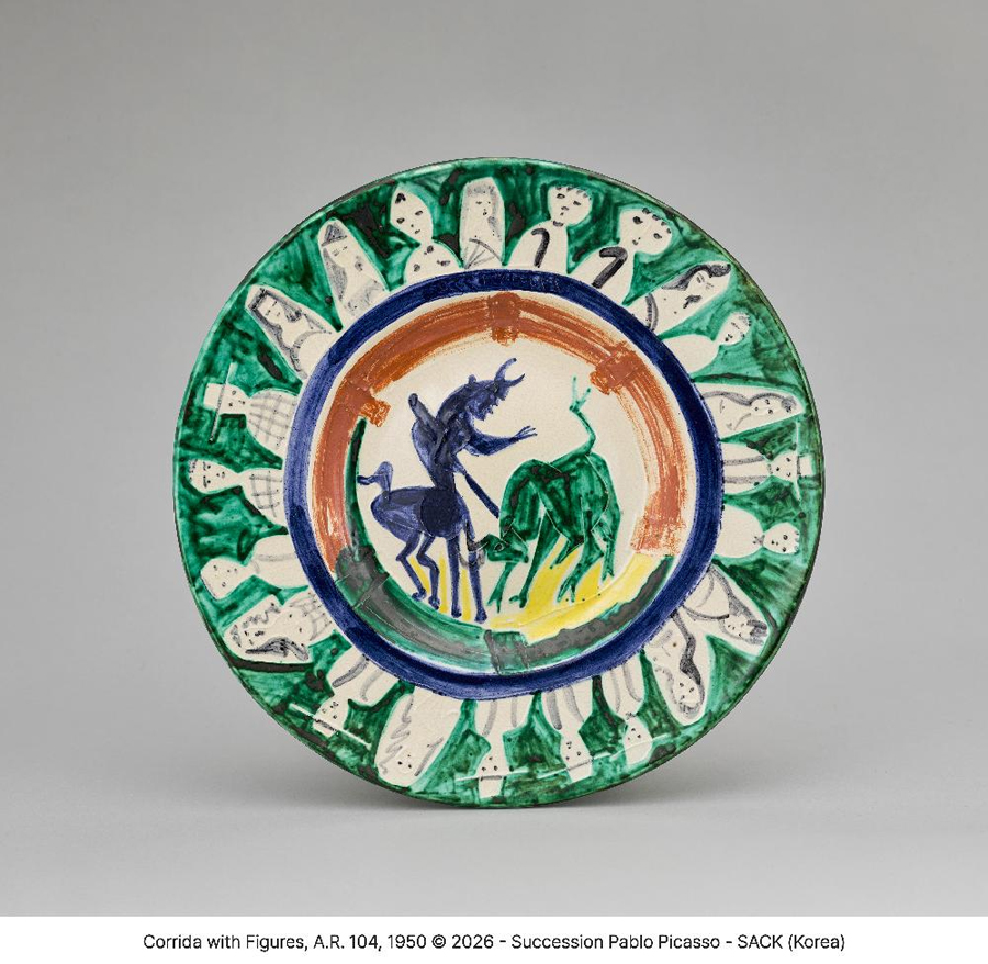 투우와 사람들, A.R. 104, 1950, 백토, 화장토 장식, 유약 시유, 38.5×38.5×5cm(자료제공: 국립현대미술관)