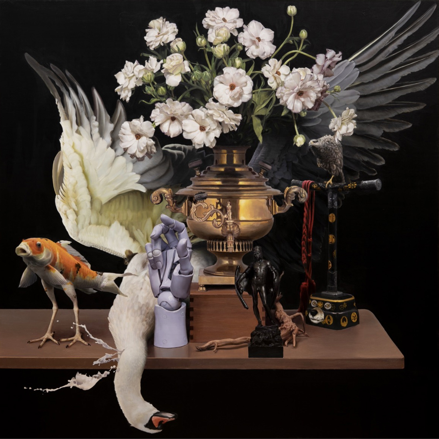 새발의 물고기와 고니 그리고 사모바르 A Bird-legged Koi, Swan, and Samovar, 2026, oil on canvas, 100 x 100 cm