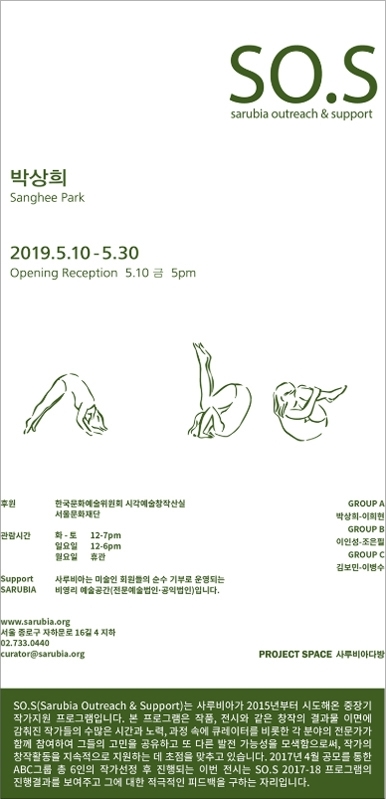 그렇다면 왜 작가는 이런 전시방식을 선택하였을까? 작가라면 누구나 작업은 시작점에서부터 끊임없는 변화를 겪어 온다. 또한 작가로서 사람들에게 주목을 받기도 했을 것이고, 좌절하기도, 예술가로써 처한 창작의 고민 이외에 삶의 환경에 대한 고민도 해왔을 것이다. 이는 실제적으로 작업에 드러나기도 하지만 그렇지 않은 경우들이 더욱 많다. 그 만큼 자신의 예술관을 세우고, 이를 유지해 나간다는 것은 모든 예술가들이 가진 어려운 일이다. 이는 박상희 작가가 프로젝트 스페이스 사루비아 다방의 프로그램인 SO.S 프로그램에 참가한 이유이기도 할 것이다. 그렇기에 이 전시는 프로그램에 참여하는 2년여의 시간 동안 전문가들과 함께 나눈 내면적 고민들이 응축되어 나타난 것으로 보인다. 특히 전시장 입구에서부터 보이는 <앞 구르기>는 그가 고민 했던 작가적 시간에 대한 의미들을 함축적으로 보여준다. 앞 구르기는 앞을 향해서 굴러가지만 일어서서 내가 제대로 가고 있는지 확인하지 않으면, 어디로 가는지는 돌고 있는 동안에는 전혀 알 수가 없다. 또한 앞 구르기를 처음 시도할 때에는 긴장과 불안함을 느낀다. 아마도 그의 작가적 삶도 앞 구르기를 하다가 확인하고 다시 구르고 또 확인하기를 반복하는 과정이었을 것이다. 이는 누구도 대신 해줄 수 없는 것이기에 혼자만의 고민으로 점철된 자기 수행의 시간이다. 이렇게 전시장에서 그가 보여주고자 하는 것은 지금까지 해온 작업에 대한 내용과 기법과 같은 것이 아니라 작가로써 응축된 심리적인 풍경이다. 그는 필자와의 인터뷰에서 자신은 너무 밖을 보려고만 했었다 라고 이야기 했듯이 SO.S 라는 특별한 프로그램을 통해 자기 자신의 내면을 되돌아보고 직시하기 위한 계기로써 이번 전시를 사용하고 있다. 지금까지의 그의 작업들은 창작자 주체의 감성을 드러내기 보다는 자신의 주변을 관찰하고 이를 조형적으로 객관화하여 특수한 도시에서 만나게 되는 삶의 환경에 대한 감각들을 관객에게 전달하였다. 그러나 이번 전시장을 구성하고 있는 설치 작업과 같은 모습은 과거에부터 현재의 작업을 단순하게 나열하는 것이 아니라 지금껏 내면에 감추어 두었던 작가 개인의 감정들을 공간 그 자체로 확장시켜 표현하고 있다. 따라서 우리가 오히려 주목해야 하는 것은 전시장에 들어서면 온전히 드러나는 박상희만의 회화적 공간이다.