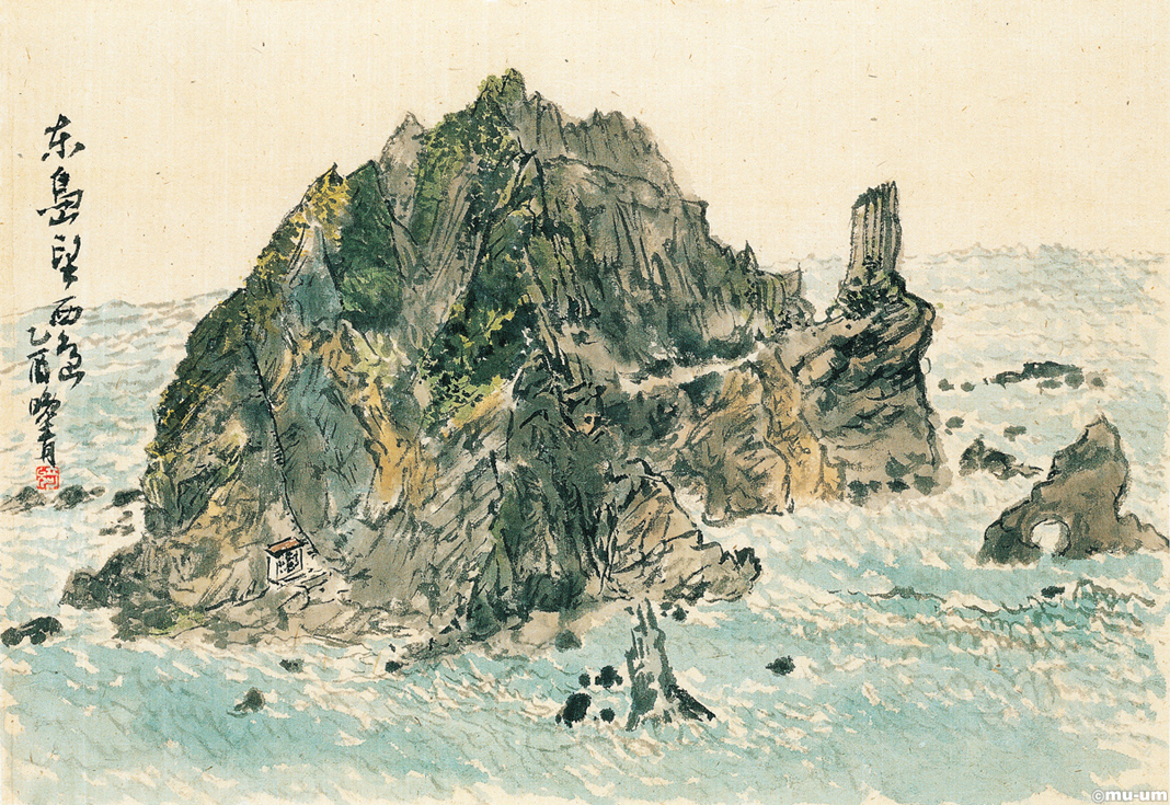 동도에서 바라본 서도 (독도), 한지에 수묵담채, 44x64cm, 2005, 작가소장