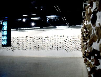보여지는 손과 보는 손 / Hands to be seen and to be read, 25Monitors 5EA. mixed media. 2380 x 350 x 1550cm. 1998