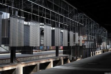 진입: 탈-과거시제의 공학적工學的 안무, 설치, 알루미늄 블라인드, 천장 구조물, 전선, 모듈 박스, DMX 레코더, 가변 크기 , 2012