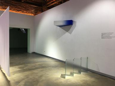 Nr.1_탈-코드화 된 빛(쿤스트독 프로젝트 스페이스), 1음절 RG LED 싸인패널 6개, 오브제(거울) 설치, 580x280x225cm, 2009